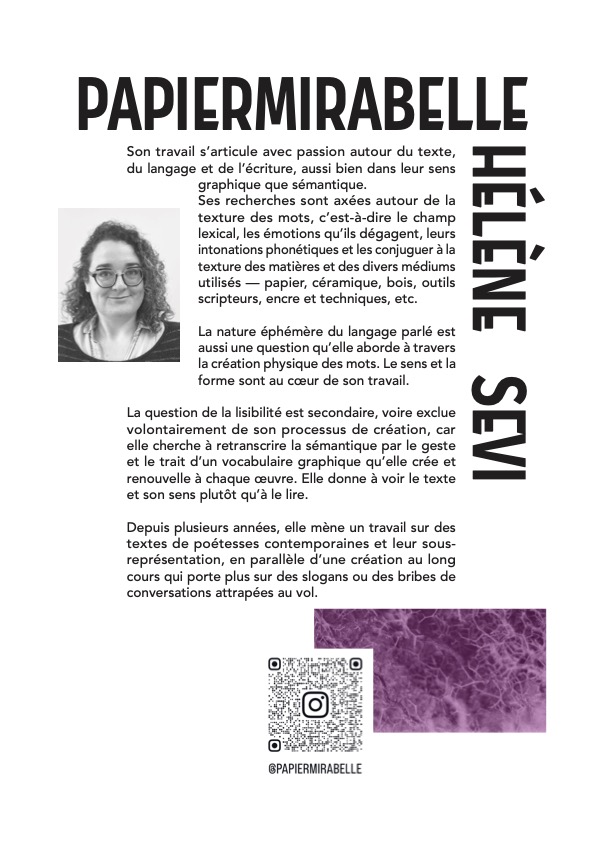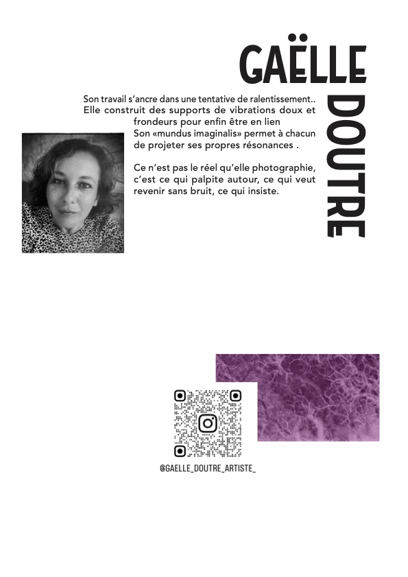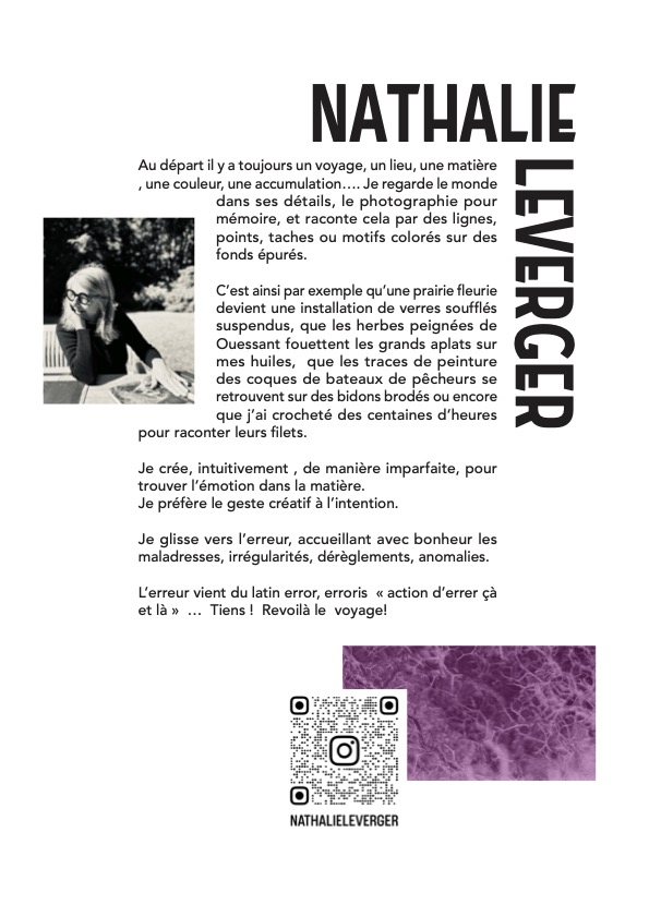 Pour les JOURNEES DES ARTISTES (JNA) 2025 , nous avons souhaité exposer à 3 : Gaëlle Doutre – photographe, Nathalie Leverger – plasticienne et Papier Mirabelle (Hélène Sevi) calligraphe qui explorons chacune la texture sous différentes formes.