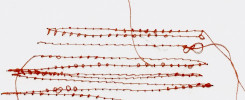 En vis-à-vis, « 200 JOURS D’EAU » sont 200 coutures sur papier à la machine 20x20cm , qui déclinent les états de l’eau — flux, remous, houle, ressac — sur une ligne d’horizon. Comme pour un journal de mer, un même horizon est décrit sur 200 jours.