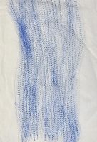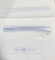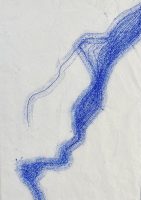 J’y trouve une résonance frappante avec un travail d’impression expérimental mené en 2022. J’introduis une feuille de papier carbone dans un papier de soie plié en quatre, je place le tout sous le pied de ma machine à coudre, et je laisse aller et venir au point droit.