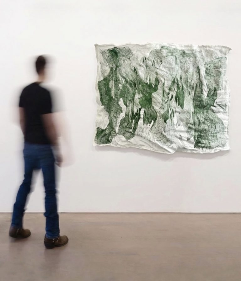C’est la première fois qu’il sera possible de la voir dans son entièreté. Je n’ai pas souhaité tendre le lin sur châssis, préférant une pose sur grillage pour créer des creux et bosses légères.