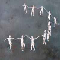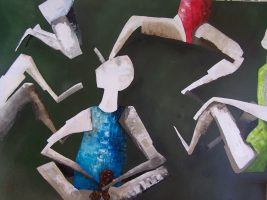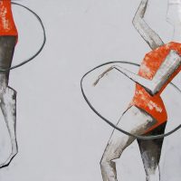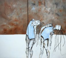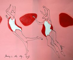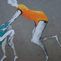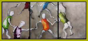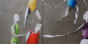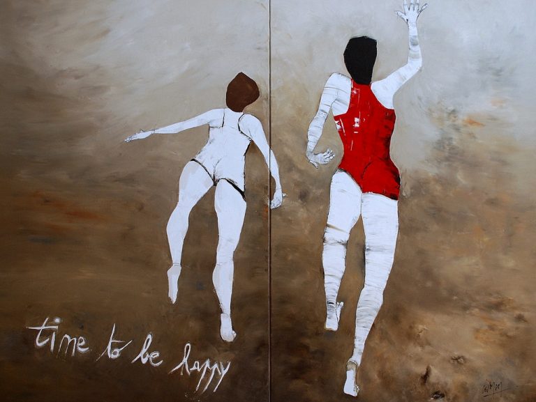 Cela commence par une grande toile 200x150cm représentant deux personnages qui s’élancent vers l’inconnu. J’ajoute ce texte « Time to be happy » comme un engagement à agir.