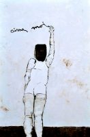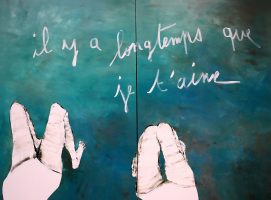As the months are going, I let more and more space around my characters. Sometimes I write words on walls, and those words become even more important than the character himself. We only see them. (“Aime moi”)