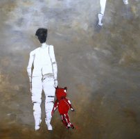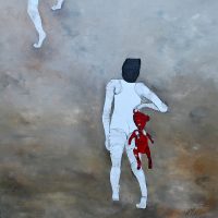 Chaque toile devient une scène à huis clos, installant des questions sur les dynamiques familiales et les émotions humaines. Les personnages, souvent non identifiables, mettent en lumière des thèmes universels tels que la quête d’appartenance et l’isolement. L’absence de détails spécifiques dans le décor — pas de meubles, pas de photos — intensifie ce sentiment de confinement, agissant comme un miroir de l’angoisse existentielle.